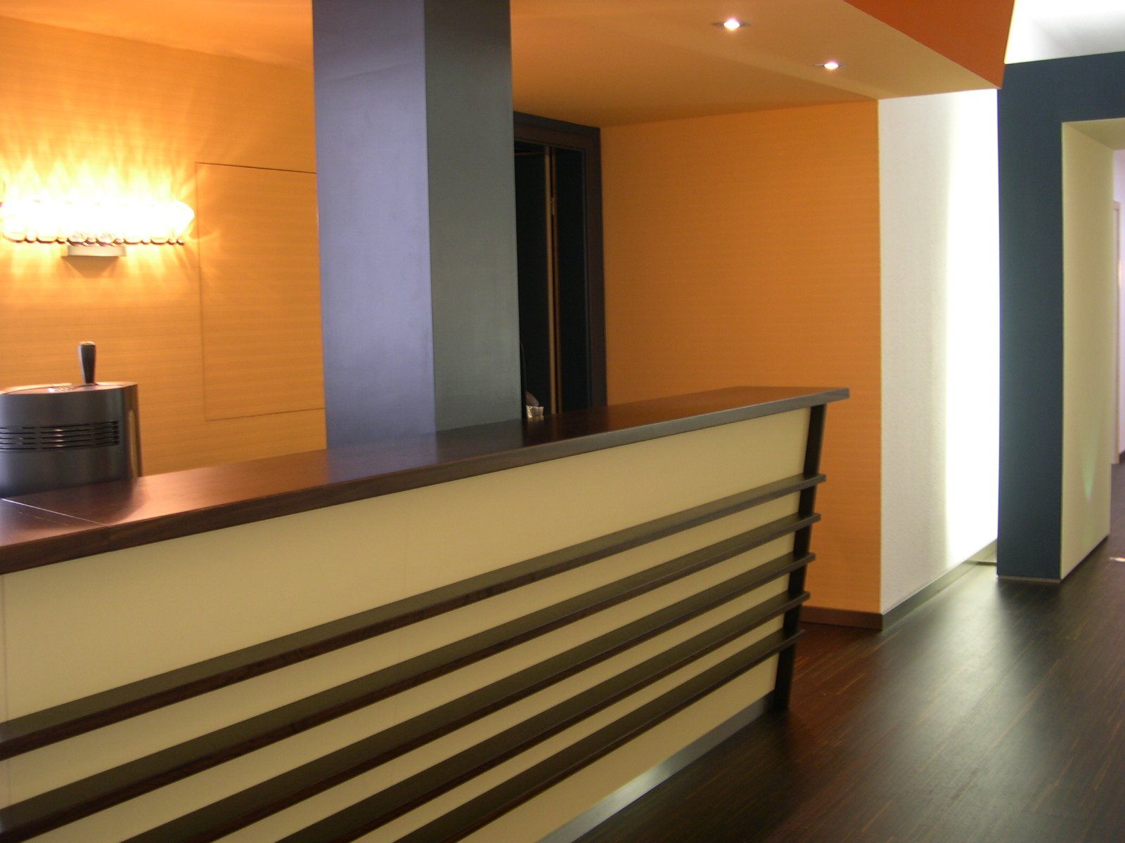 Hinter der Theke ist eine Spezialtapete von Caparol, die mit orangenfarbiger Latexfarbe gestrichen wurde.