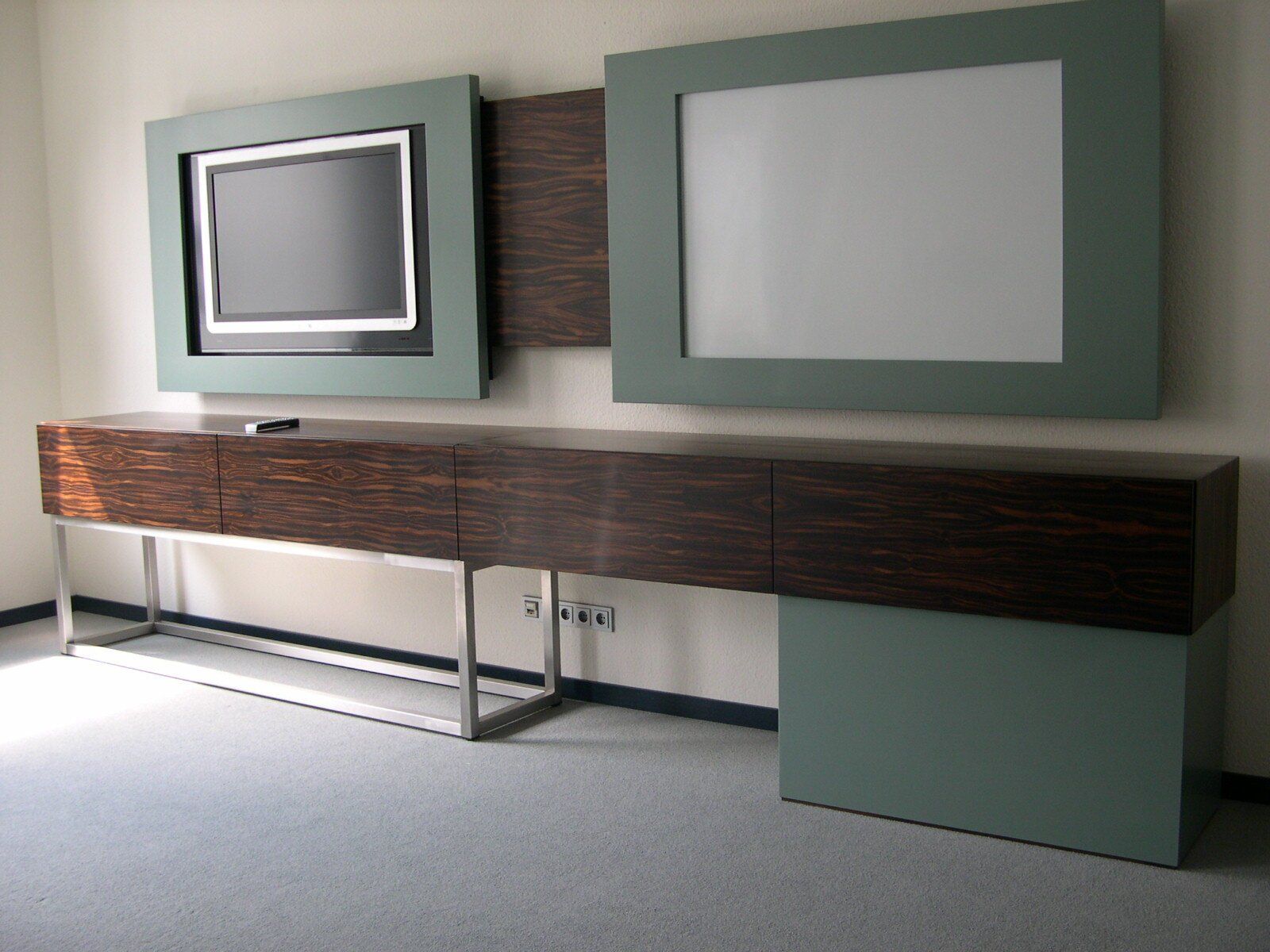 Im Besprechungsraum ist der Besprechungstisch von 4m x 1,40m und das Sideboard mit edlem Macassar- Furnier gearbeitet.